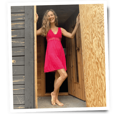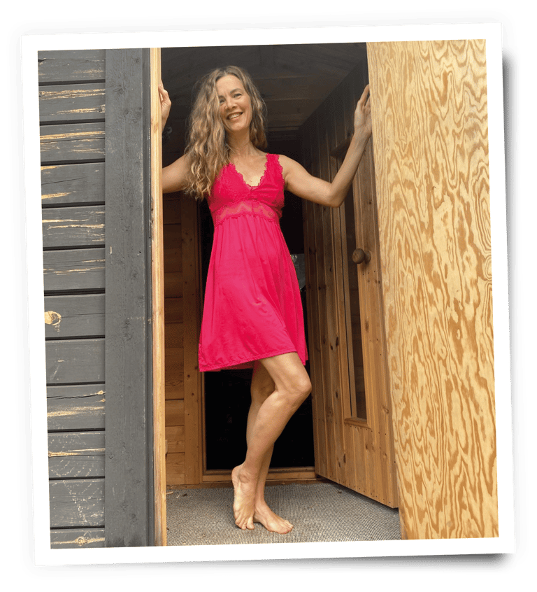 Me at the doorway of that same sauna. This was from the final day of the reunion, during our "sexy clean-up party" – dominantly commanded by none other than Donna herself 💪🔥😅. A lighter, cheekier flavor of feminine power. And so much fun.